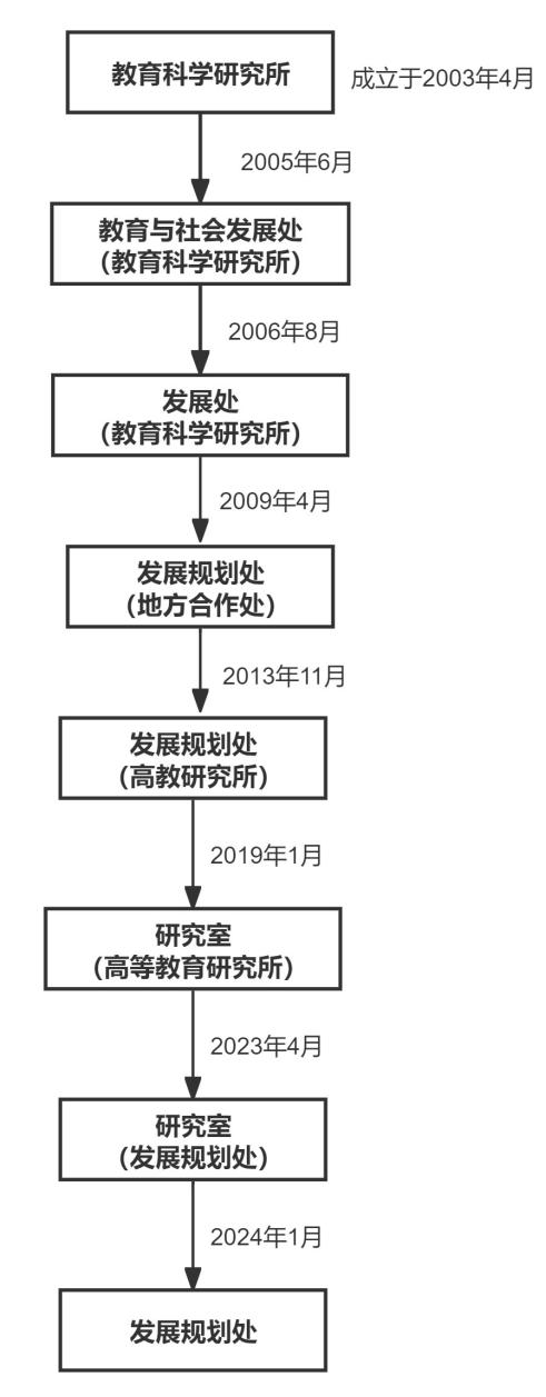 台州学院发展规划处,原名教育与社会发展处(教育科学研究所),成立于2005年6月。其前身之一为成立于2003年4月的教育科学研究所。教育与社会发展处与教育科学研究所是两块牌子一套人马,合署办公。2006年8月教育与社会发展处更名为发展处。2007年7月,教育科学研究所更名为教育科学研究中心。2009年4月,学校机构调整,发展处(教科所)更名为发展规划处(地方合作处)。2013年11月,学校机构设置调整,地方合作处调整为与科研处合署,并更名发展规划处(高教研究所)(内设校友办公室)。2019年1月,学校机构设置调整,发展规划处调整为与地方合作处合署,并设立台州学院研究室(高等教育研究所)。2023年4月,学校机构设置调整,发展规划处与研究室合署,并更名为研究室(发展规划处)。2024年1月,更名为台州学院发展规划处。