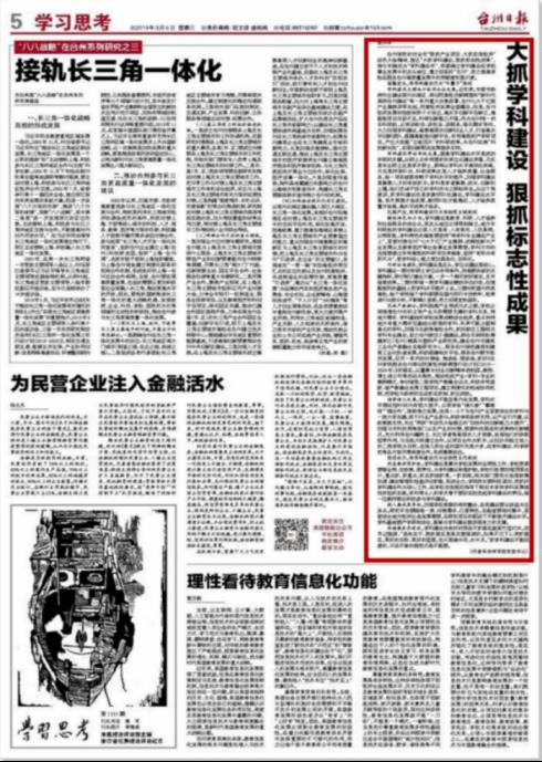 编者按:2019年3月6日,《台州日报》刊登校党委书记崔凤军的署名文章《大抓学科建设 狠抓标志性成果》。文章指出,今年是学校的“学科建设年”,学校提出“大抓学科建设,狠抓标志性成果”,从“高擎龙头,将学科建设作为‘牛鼻子’来抓”“扎根产业,将学科建设作为系统性工程来抓”“形成合力,将学科建设作为全局性工作来抓”等方面,论述了学校如何牢固确立学科建设在学校事业发展中的龙头地位,努力提高学校在服务台州高质量发展中的贡献度和显示度。