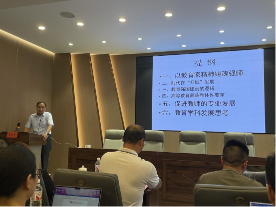 9月9日下午,中国教育科学研究院马陆亭研究员应发展规划处的邀请,来到教师教育(体育)学院,作题为《弘扬教育家精神 促进教师专业发展》的学术报告。学院党委书记林辉杰主持,学校相关部门负责人出席,学院党政领导班子成员和科研骨干教师参加。