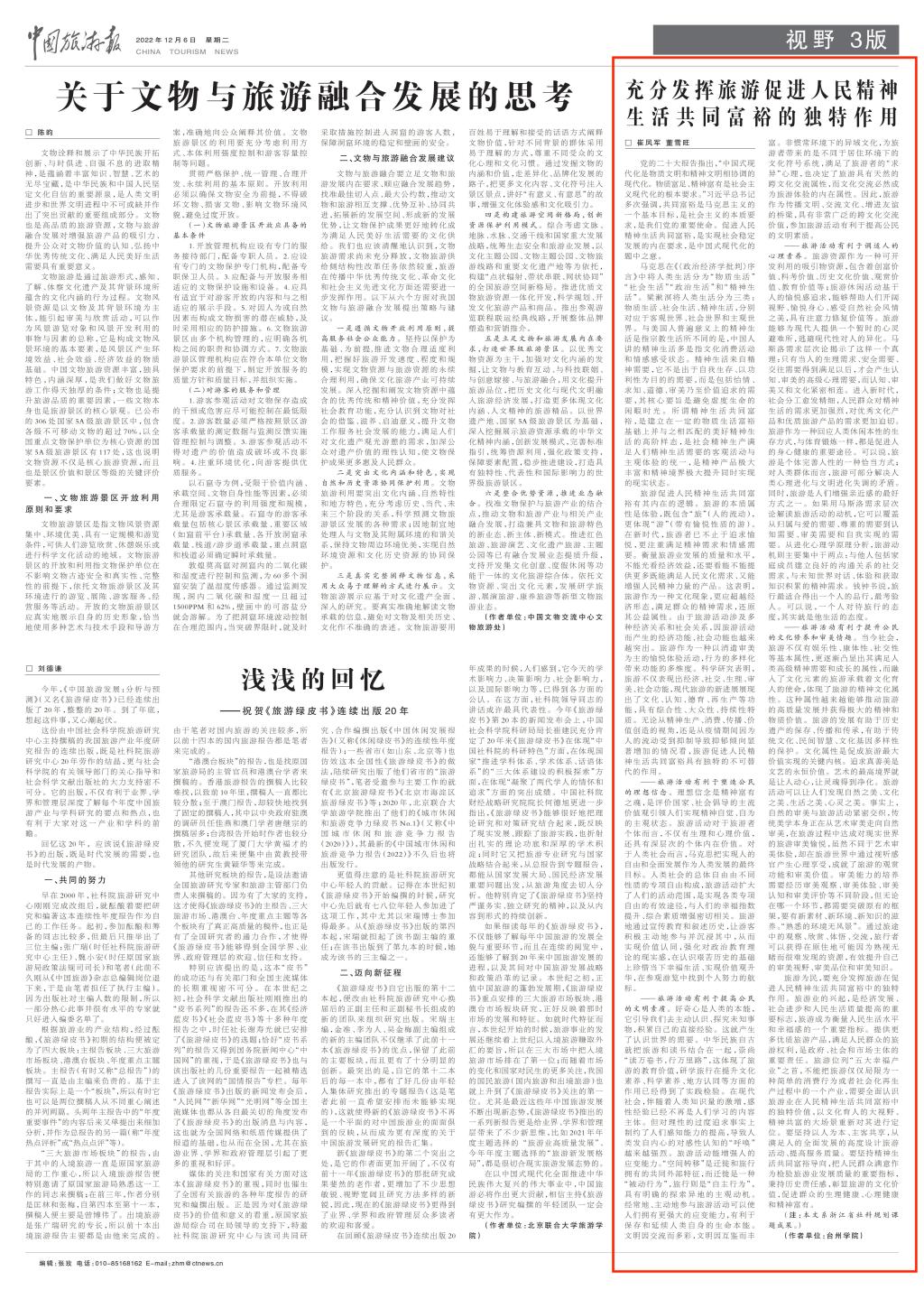 近期,台州市文化和旅游研究院成果频出,崔凤军教授为第一作者的《充分发挥旅游促进人民精神生活共同富裕的独特作用》《扎实推进人民精神生活共同富裕》分别刊载于《中国旅游报》2022年12月06日03版和《浙江日报》2023年01月09日理论周刊07版。