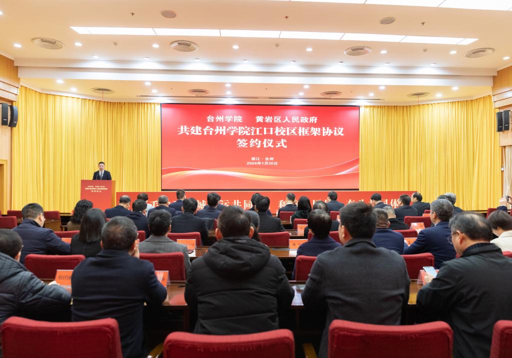 为更好地贯彻落实教育强国战略、高教强省部署和台州市关于教育提质的要求,1月30日,台州学院、黄岩区人民政府——共建台州学院江口校区项目框架协议签约仪式隆重举行,标志着台州学院江口校区建设正式启动。这是学校办学历史上的一件“大喜事”,为学校今后高质量发展打下了良好基础。台州市委副书记苗伟伦、副市长李昌明、市委办市府办等相关部门领导,黄岩区四套班子主要领导及相关部门负责人,台州学院党政班子成员及相关部门负责人出席仪式。仪式由台州市人民政府副市长李昌明主持。